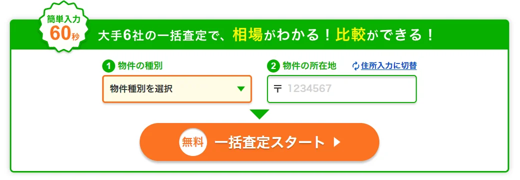 不動産一括査定サイトは数多くありますが、この大手6社に一括査定依頼できるサイトはすまいValueだけです。最短60秒で一括査定の申し込みが完了し、査定依頼だけでは費用はかかりません。