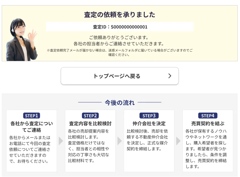 以下の画面が表示されたら、査定の依頼が完了です。