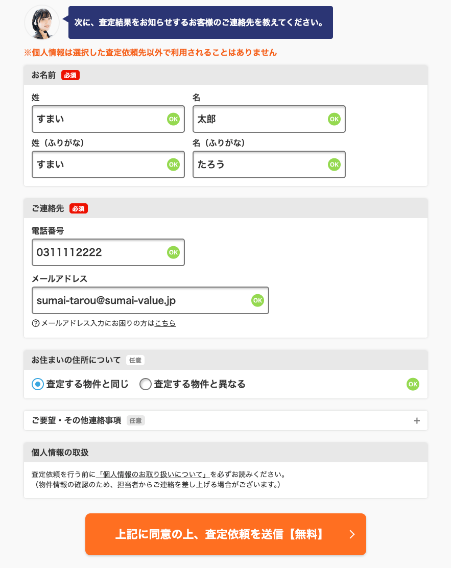 名前と連絡先を入力したら、「個人情報のお取り扱いについて」を確認します。物件のエリアから、査定依頼が可能な不動産会社が表示されるため、依頼したい会社にチェックを入れ、「上記に同意の上、査定依頼を送信【無料】」を押してください。