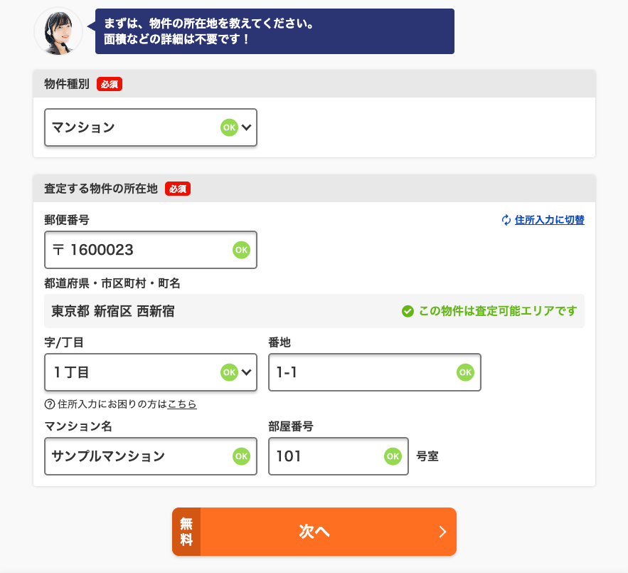 査定の申し込み画面で、物件の詳細情報を入力し、「次へ」を押してページを進めます。
